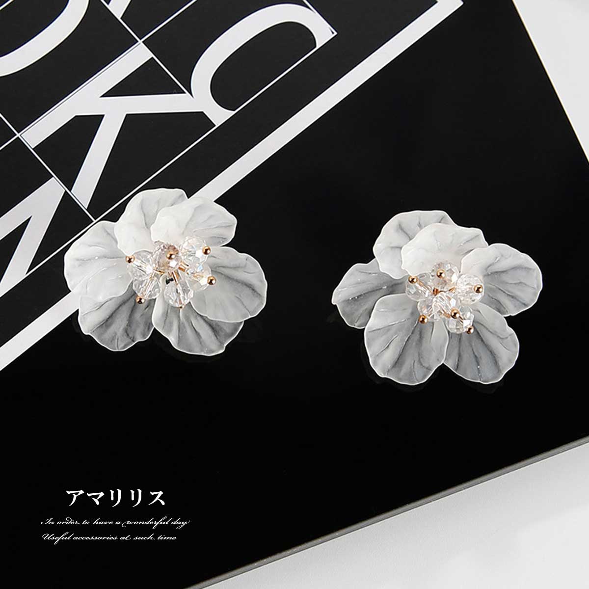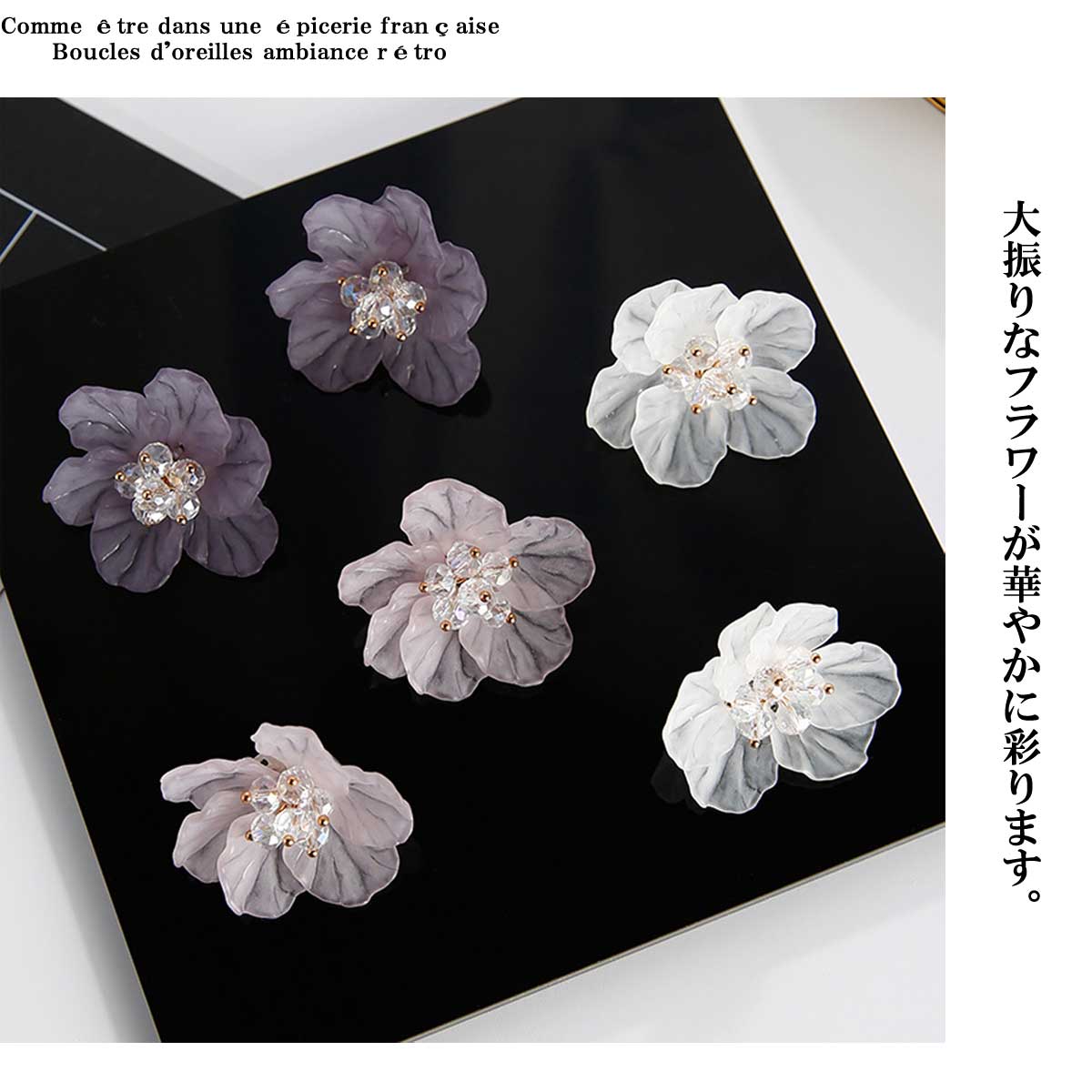 ボリューミーなフラワーがかわいらしさを演出してくれるフラワーピアスで登場! ガーリーな印象でキュートに活躍してくれるフラワーピアス 透け感のある花びらに中心にはクリアビーズが華やかさをプラス。